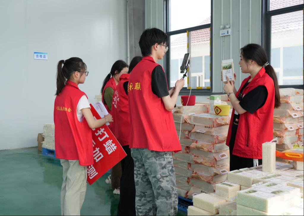 “家人们,这袋朔湖春·粳香米来自段庄村的生态稻田,脱壳、分拣全流程透明化,水雾抛光,无打蜡、0添加、可追溯,每一粒都藏着乡亲们的汗水……”在朔湖米业直播间里,学生们化身“理论宣讲员+助农主播”,既用专业术语介绍稻米品质,更用朴实语言讲述着乡村振兴故事。丁杰书记也走进直播间,与大学生们一同推介农产品。这场“理论+实践”的直播,不仅是带货,更是一堂鲜活的“乡村振兴思政课”,让学生们在与村民的互动中理解“共同富裕”的内涵,在销量增长的数字里体会“实践是检验真理的唯一标准”的深意。