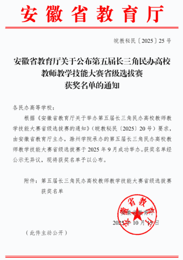 日前,由安徽省教育厅主办的第五届长三角民办高校教师教学技能大赛省级选拔赛结果正式公布。我院李邦老师凭借出色表现,在众多参赛教师中脱颖而出,取得思政中级及以下职称组三等奖的优异成绩。